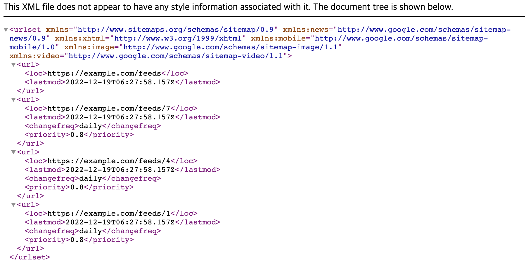 이제 pages/server-sitemap-feeds.xml 이라는 디렉토리를 생성하고, 그 안에 늘 해왓던대로의 next.js 코드를 작성하면 된다. next의 getServersideProps를 이용하기 때문에, 크롤러가 https://example.com/server-sitemap-feeds.xml 이라는 페이지에 접근하는 순간 서버사이드렌더링으로 현재까지 작성된 feeds의 id를 쭉 불러와 sitemap.xml의 형식으로 작성하여 크롤러에게 전달해주는것이다.